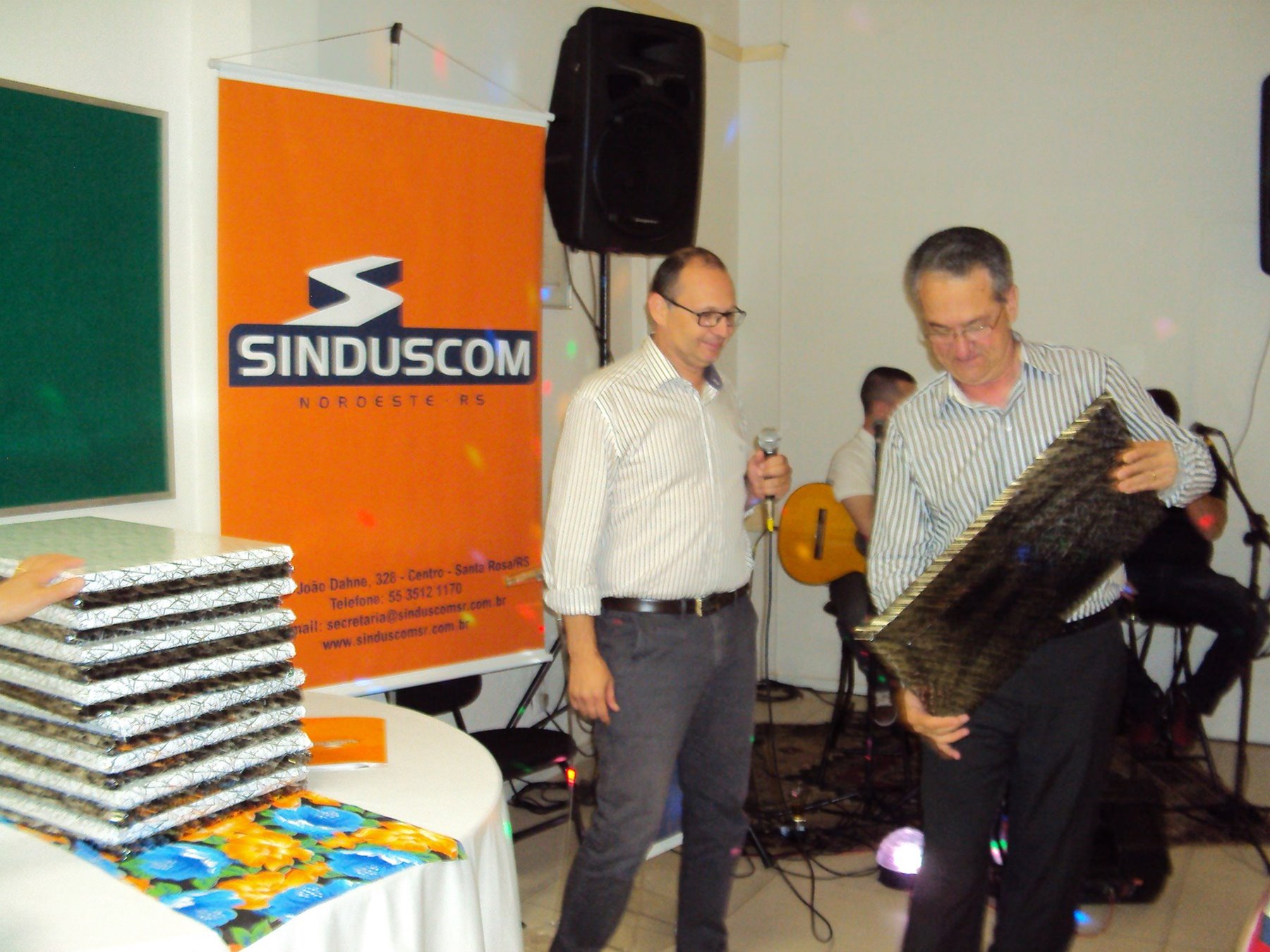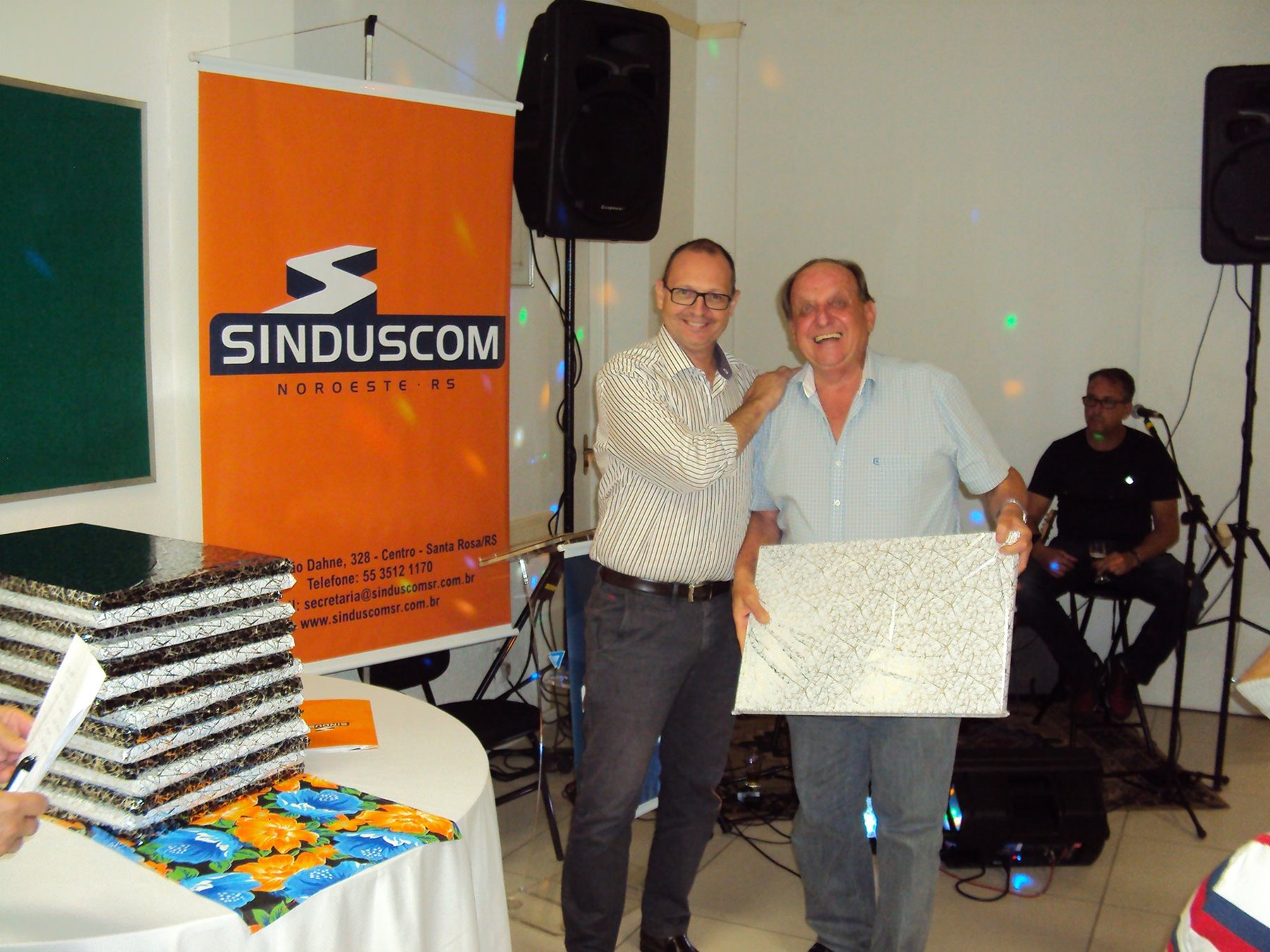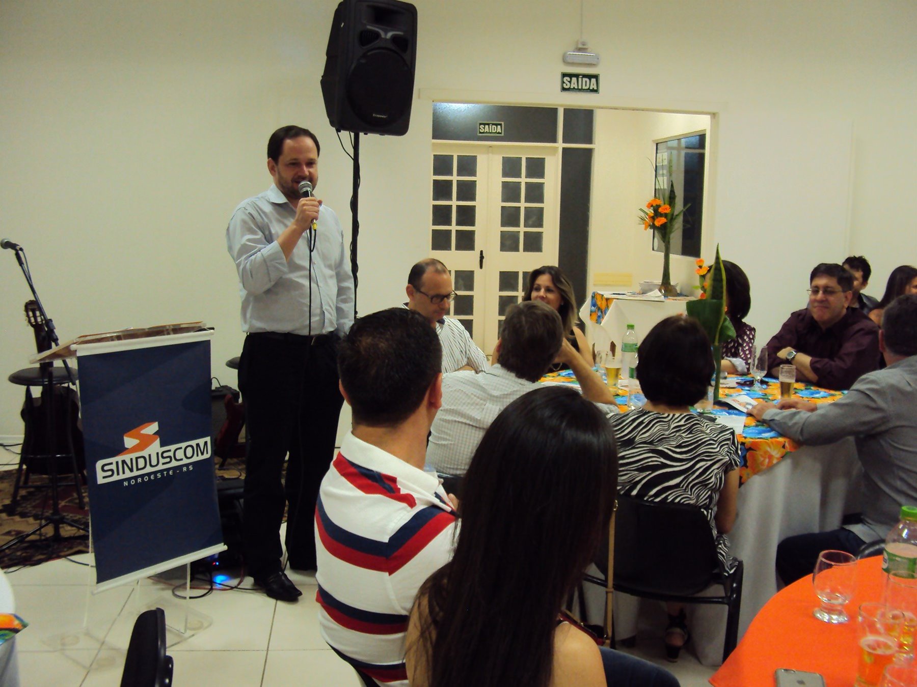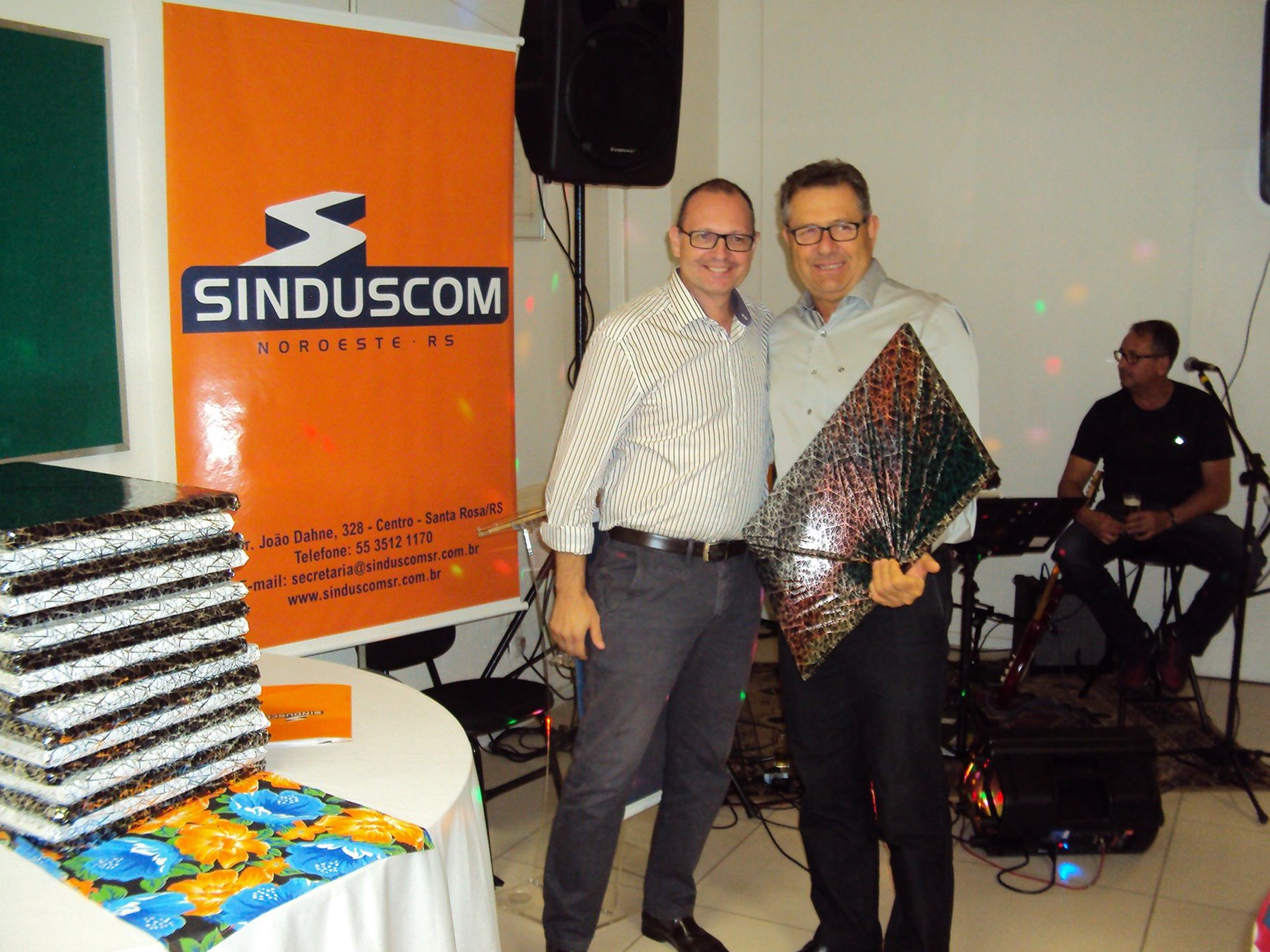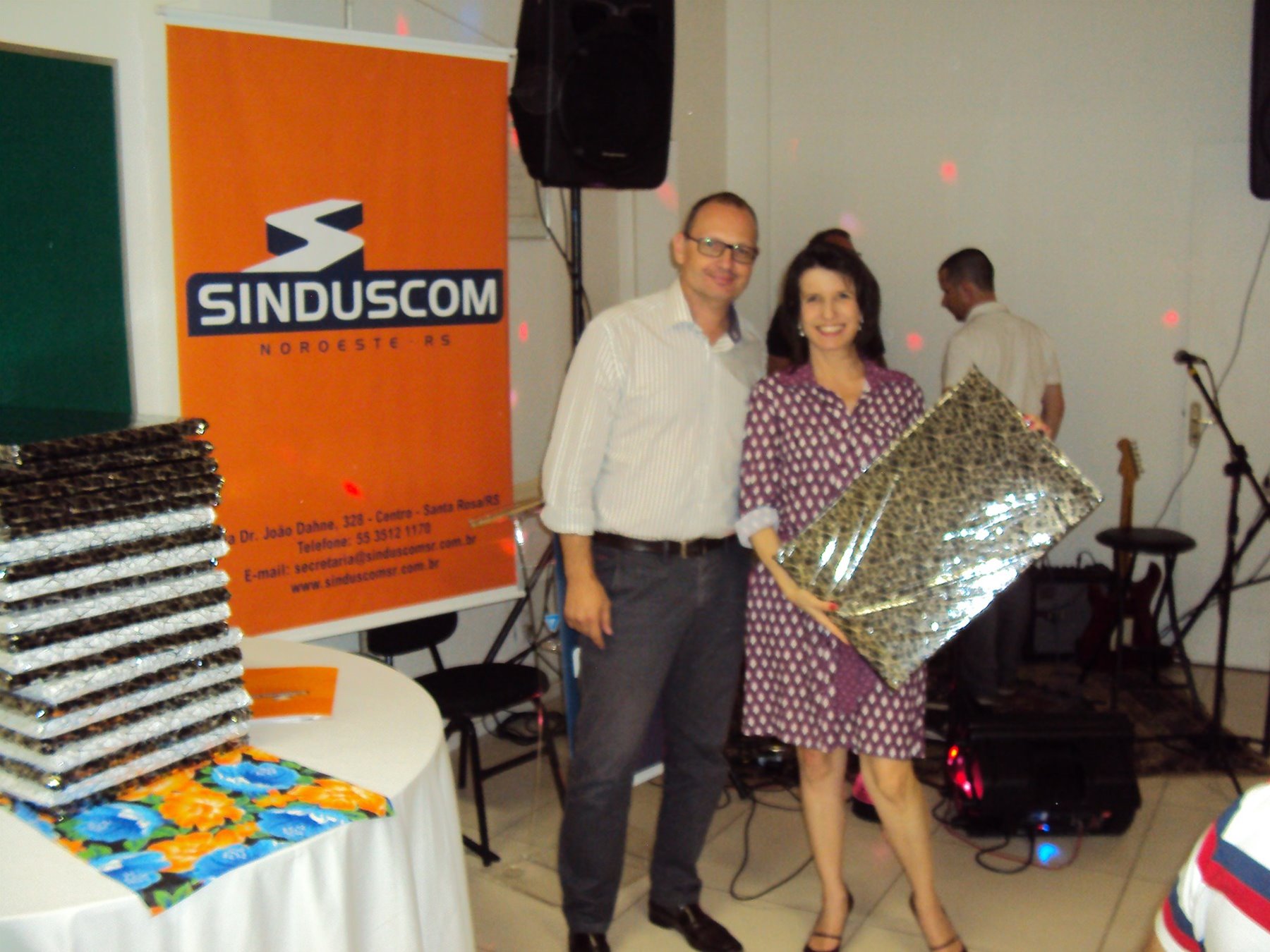 No dia 15 de dezembro de 2016, o SINDUSCOM Noroeste RS realizou seu último evento do ano. Foi uma reunião jantar de final de ano, em sua sede e com casa cheia. Na oportunidade o presidente George Aléssio fez um relato das principais ações desenvolvidas durante o ano, com destaque nas parcerias e união com as demais entidades, que atuam em prol do desenvolvimento de Santa Rosa e região, como a INDUMÓVEIS, AGÊNCIA DE DESENVOLVIMENTO, ACISAP e APEA.SR. Os presidentes destas estavam presentes e também se manifestaram, respectivamente: Ademir Meinerz, Artur Lorentz, Cicilia Liberal Paes e Rodrigo Meinerz. As manifestações foram unanimes em relação ao cenário econômico brasileiro, em que as empresas, apesar das dificuldades, sobreviveram e com a esperança de ter o ano de 2017 melhor. Algumas das ações lembradas foram: Programa de Saúde e Segurança do Trabalho com o SESI; Seminário sobre PPCI´s; DNCS - Dia Nacional da Construção Social; Encontro com Ministro; Encontro e Demandas aos candidatos a Prefeito de Santa Rosa; Apoio e participação no CONECTA; Representação ativa nos Conselhos Municipais; Realização das Reuniões mensais e as Parcerias e apoios constante das entidades. O presidente Aléssio, também citou e agadeceu os empresários de Santa Ângelo (Toscani e Parnoff), que estavam presentes e informou sobre a Extensão de Base, do Sindicato, que o processo avançou e aguarda-se a publicação por parte do Ministério do Trabalho. Durante o evento os associados presentes, bem descontraídos, participaram do jantar, receberam um mimo e assistiram uma apresentação artistica.